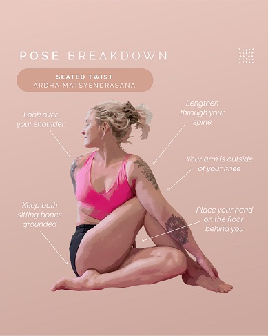 - Exhale and gently twist your torso toward the bent knee. Place your right hand behind you for support and bring your left arm across your body to hug the knee or rest the elbow outside it.